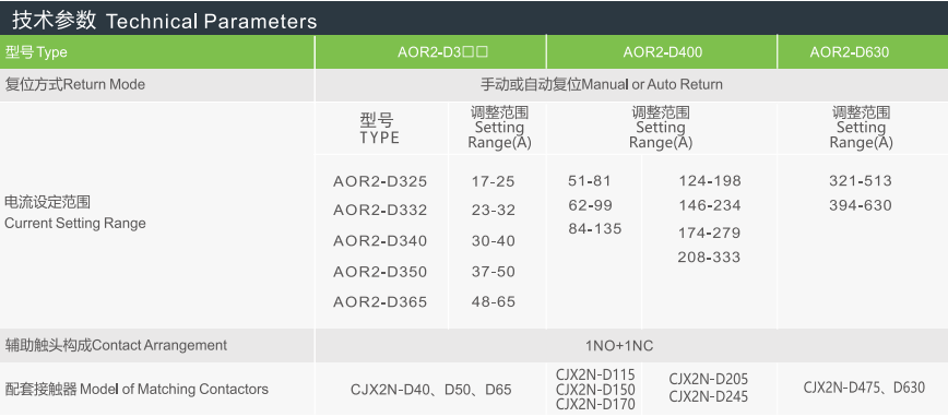 AOR2-D series thermal overload relay is used in the power network of AC 50Hz or 60Hzvoltage up to 660V,current of 93A and below, it protectsthe circuit and electromotor from overload, phase loss, long starting duration, and long blocking duration, With the diferental mechanism, temperaturecompensation ,adjustable seting curent,and optional auto or manual resetting, t can be working individually or assembled with CJX2 AC contactor.